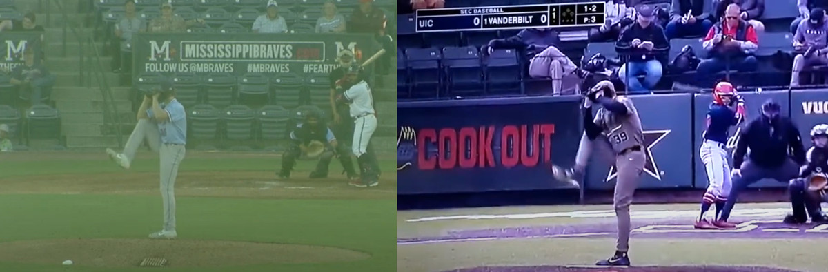 The big debut wasn’t just a pretty box score, either. Eder came out of the gates showing some improvements to his game, presumably a result of his work at Marlins camp during the offseason. Watching him work during his Pensacola outings, there have been some noticeable mechanical differences vs. his Vanderbilt days. Immediately, he looks a lot more upright as he starts his delivery, as illustrated below—on the left is Eder at the top of his windup with Pensacola, and on the right with Vanderbilt in 2020: