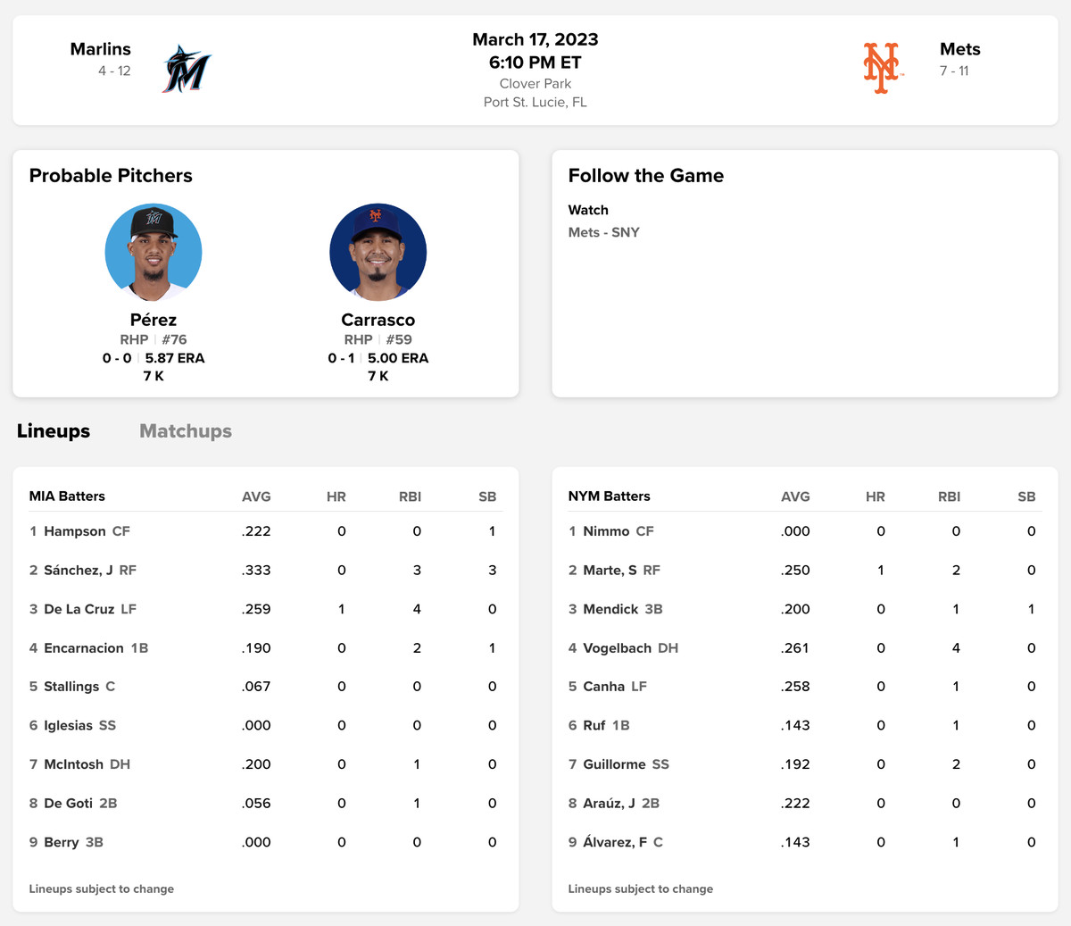 The other half of the Marlins roster is in Port St. Lucie to take on the Mets at 6:10 p.m. Eury Pérez will make the start.