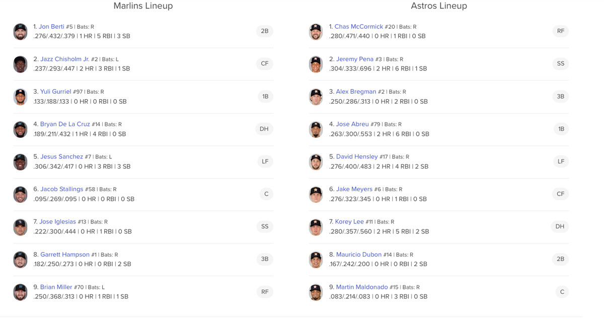 Jesús Luzardo took the mound for the first time since his World Baseball Classic appearance against Team Israel. Luzardo had a solid outing, striking out five and only allowing two runs. The Astros got on the scoreboard in the bottom of the third inning due to a Chas McCormick double that drove in Korey Lee, who singled earlier in the inning. After McCormick’s double, Jeremy Peña hit an RBI double that scored McCormick.