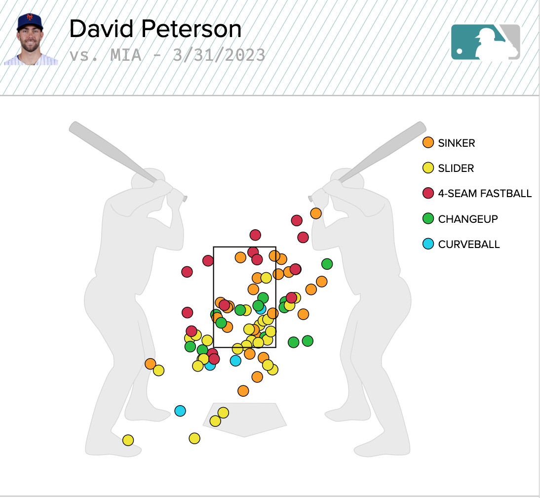 For Mets starter David Peterson, he also had himself a nice outing. Although he gave up eight hits, he only allowed one run (the Soler homer) and struck out five. Peterson worked the lower portion of the strike zone and saw a lot of success. He had 11 swings-and-misses.