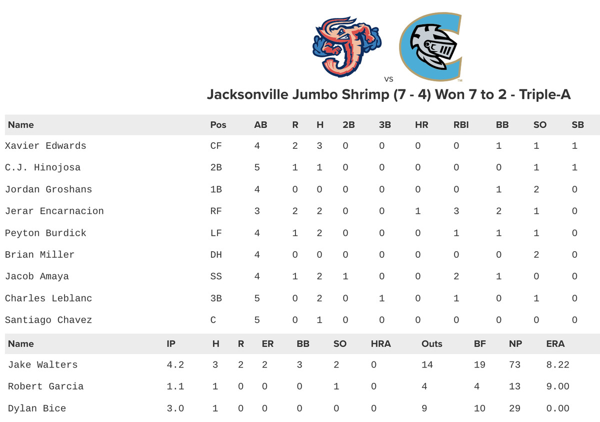 Xavier Edwards continues to have success with the Jumbo Shrimp. Offensively, Edwards had three hits and a walk. Something to note is that he is playing center field. That defensive versatility should accelerate his journey to the big leagues, perhaps by the second half of 2023. With his speed, it makes sense to as why Edwards is experimenting with this position.