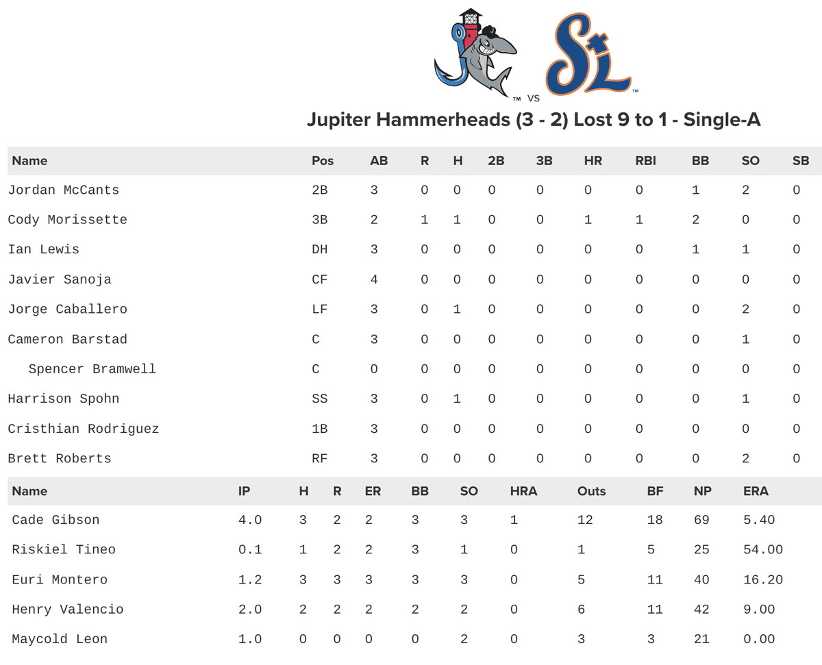 Aside from the Cody Morissette homer, we didn’t see too much action from the Hammerheads offense. Only a hit from Jorge Caballero and Harrison Spohn. Jupiter drops the game to a final score of 9-1.