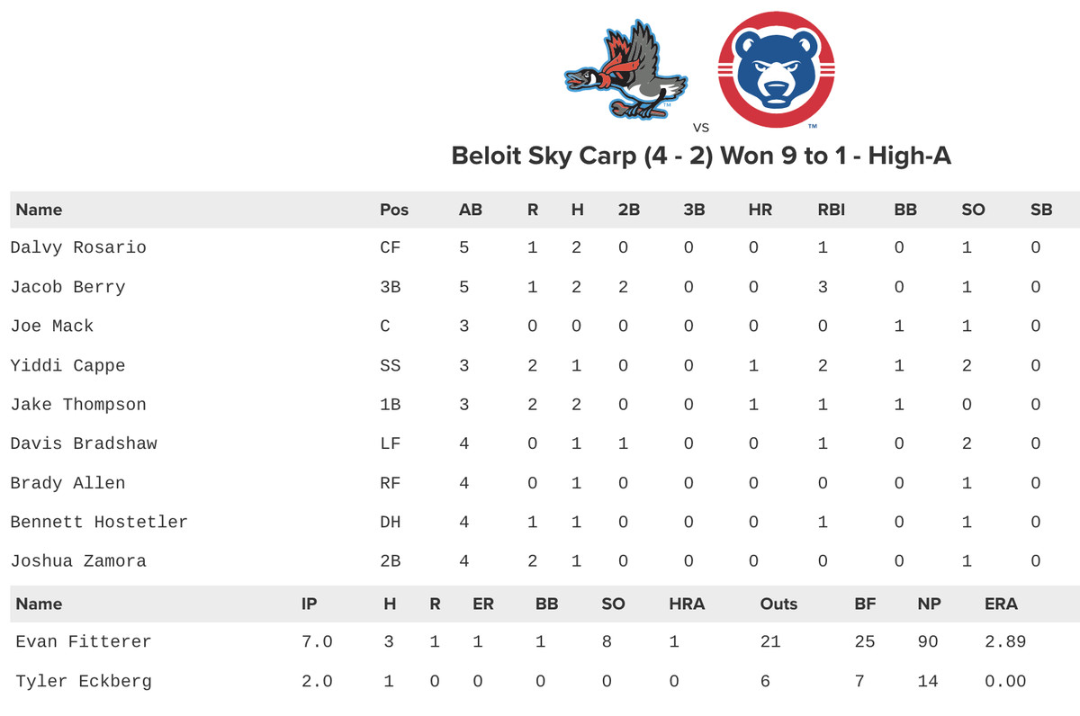It was a very nice outing for the Sky Carp. Everything was clicking for them. Even the slumping Joe Mack contributed by drawing a walk. Sky Carp are back at it on Friday at 7:05 pm against the same South Bend Cubs.