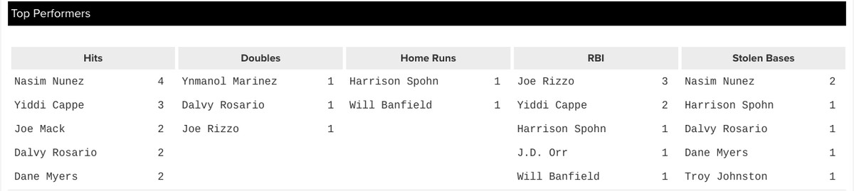 Nasim Nuñez went four-for-five with four singles and two stolen bases. He continues to show promise on the offensive side of the ball to go along with his special defense at shortstop.
