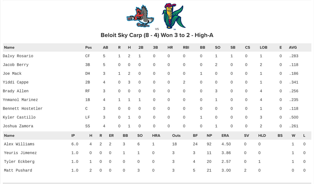Offensively, the Sky Carp had 10 hits, and Yiddi Cappe was a big contributor to today's game as usual. In the bottom of the fifth inning, Cappe smacked an RBI single which drove in Dalvy Rosario. In the seventh inning, Cappe did the same thing and smacked an RBI single.