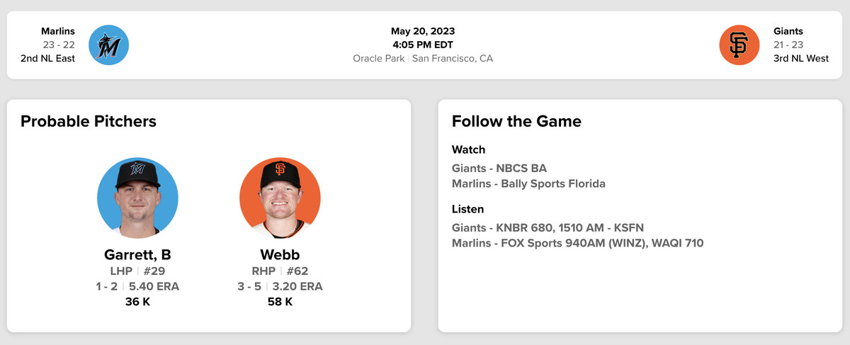 Welcome to Saturday’s Marlins (23-22, -53 RD) vs. Giants (21-23, -19 RD) game thread.