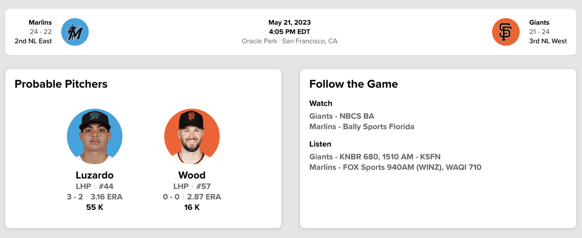 Welcome to Sunday’s Marlins (24-22, -52 RD) vs. Giants (21-24, -20 RD) game thread.