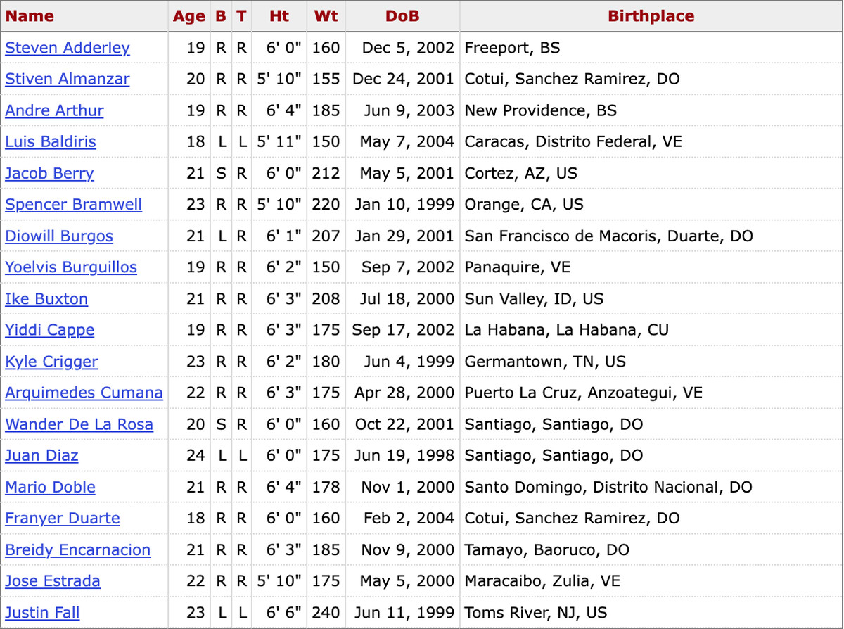 Complex league “teams” are highly unconventional. At their core, you’ll find plenty of newly signed professional baseball players, matriculating straight from high school or college, or in the case of international players, from the Dominican Summer League. But the FCL is also a waystation for veterans rehabbing from injuries and imports from independent circuits (Anthony Bender, Elieser Hernandez and Jordan Holloway are among the Marlins big leaguers who passed through in 2022). Unlike the DSL, in-season promotions are commonplace, so rosters lack continuity.