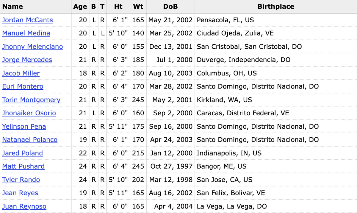 Right-hander Jorge Mercedes had an eye-popping 41.7% strikeout rate. Signed way back in 2018, his professional debut was delayed until this season due to COVID and Tommy John surgery. Mercedes doesn’t often know where the ball is going (25.0 IP, 17 BB, 5 HBP, 6 WP), but his fastball velo routinely tops 100 miles per hour.