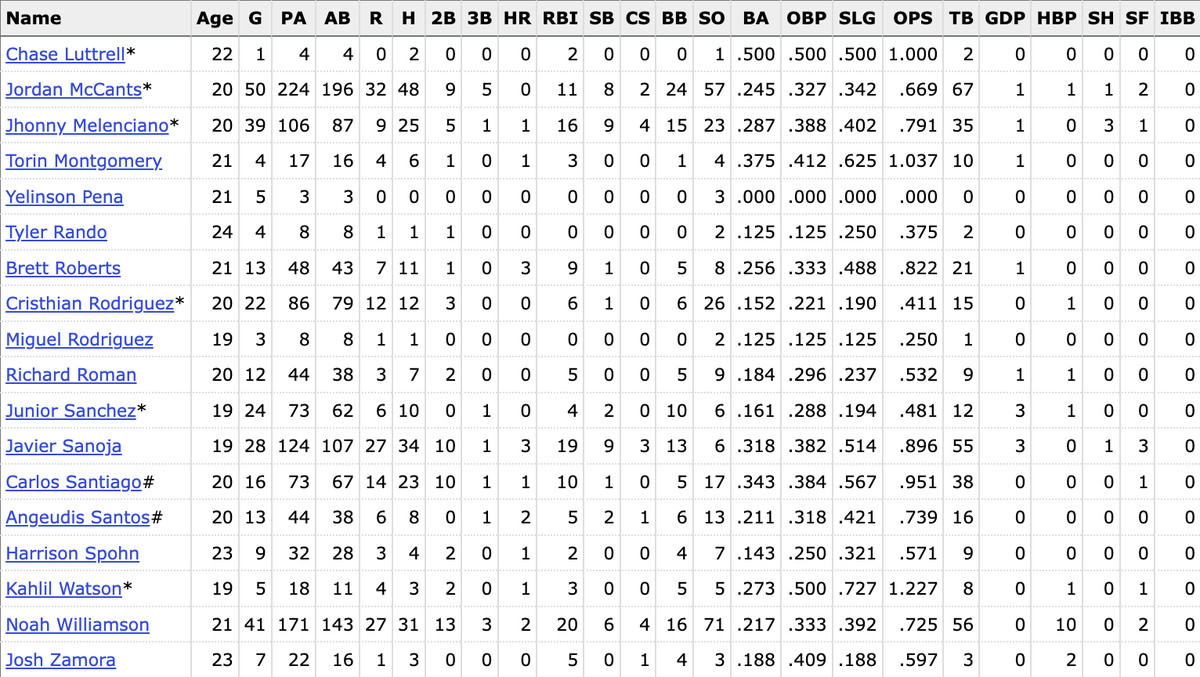 Carlos Santiago (156 wRC+) and Javier Sanoja (143 wRC+) were both phenomenal in the FCL and ultimately played the majority of their summer with the Hammerheads. Sanoja struck out only six times in 124 plate appearances (4.8 K%). The video below is a Santiago grand slam courtesy of Fish On The Farm’s Alex Carver.