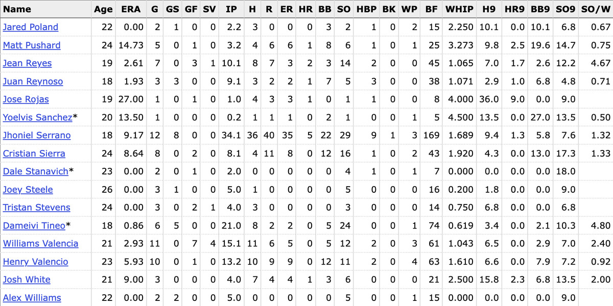 Dameivi Tineo dominated the FCL, including a 10-strikeout start on July 28 that earned him a promotion. The 6-foot-3 left-hander has a low-90s fastball that plays up because of the great extension he gets off the mound. He also throws a changeup and a slurvy breaking ball. Tineo just turned 19 during the season, so there’s ample time for his command to improve enough to be taken seriously as a long-term starter candidate.