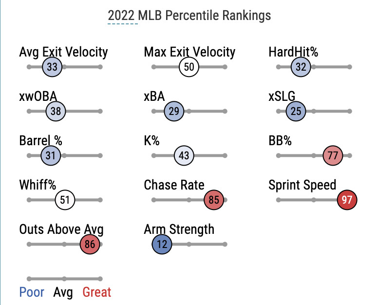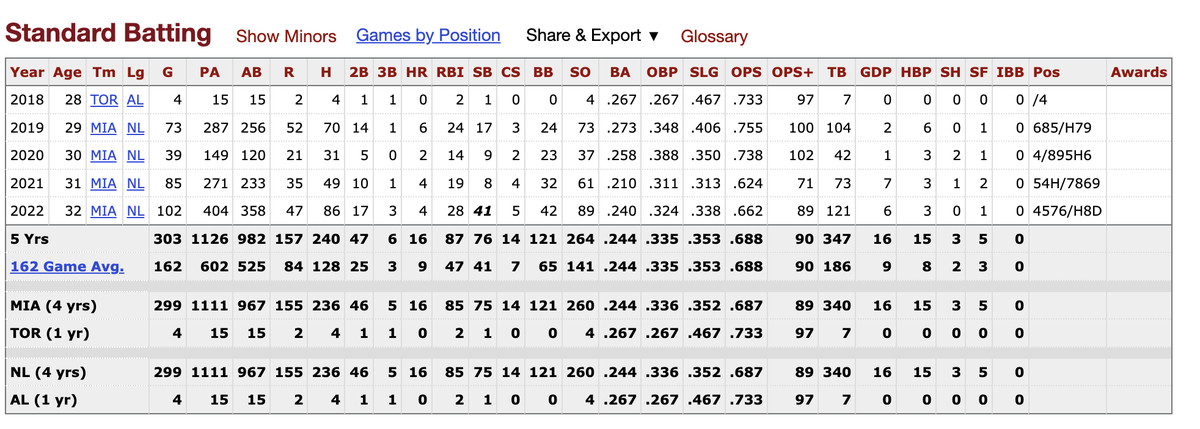 In 2022, Berti’s bat ranked below the league average in many key categories, including expected slugging percentage, barrel rate and average exit velocity. He only managed an OPS of .662—he was 5th on the team, but that’s just a reflection of the lack of quality hitters who played for the Marlins last season. According to Baseball-Reference, his bat was worth minus-1 runs, which ranked 381st in all of baseball.