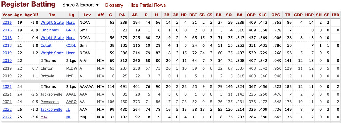 Burdick is coming into the 2023 season having gained much-needed major league experience the season prior. In his limited appearances, he demonstrated the ability to produce hard contact. He ranked fifth among all Marlins players in average exit velocity (90.0 mph) behind only Jorge Soler, Bryan De La Cruz, Jerar Encarnación and Jazz Chisholm Jr. He has the potential to be a legitimate power hitter as indicated by his .462 slug% and 49 home runs in 282 career minor league games.